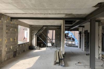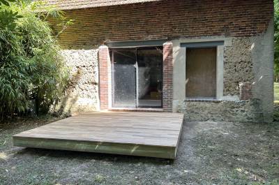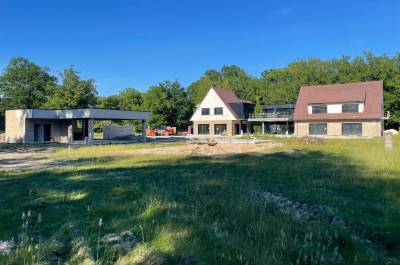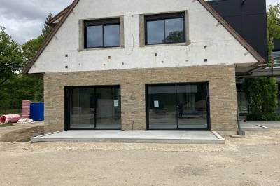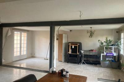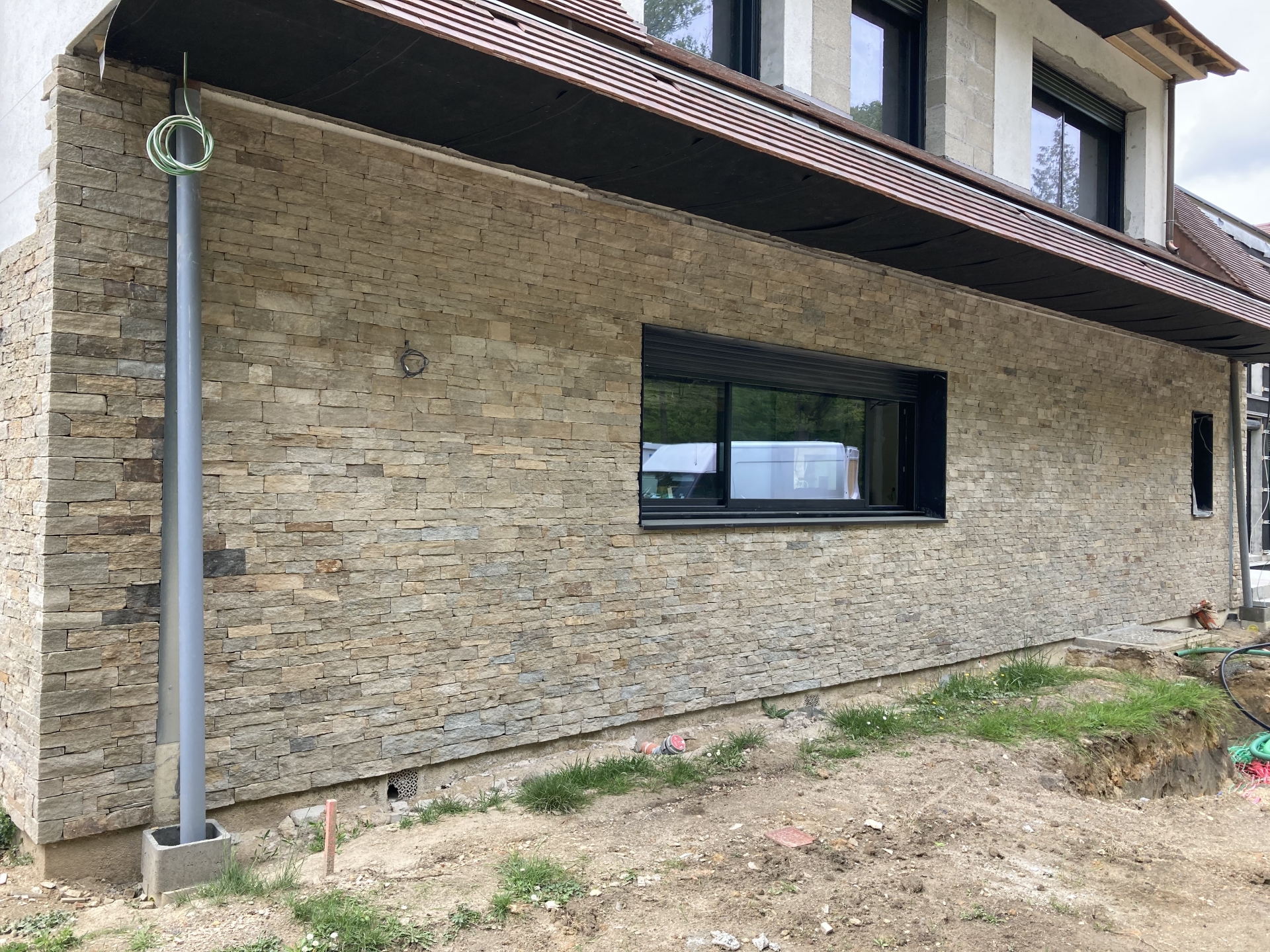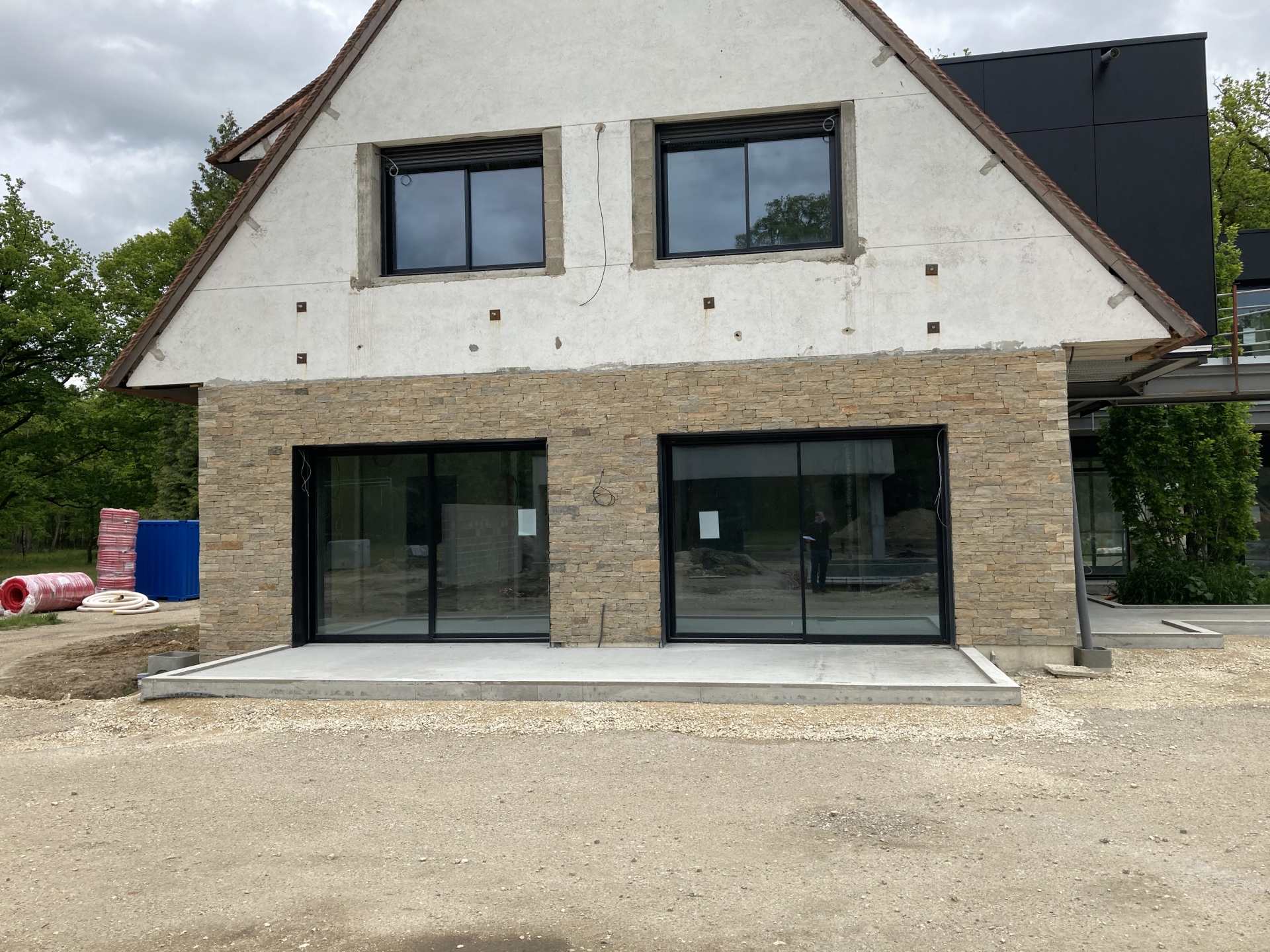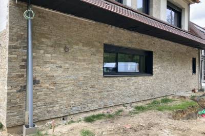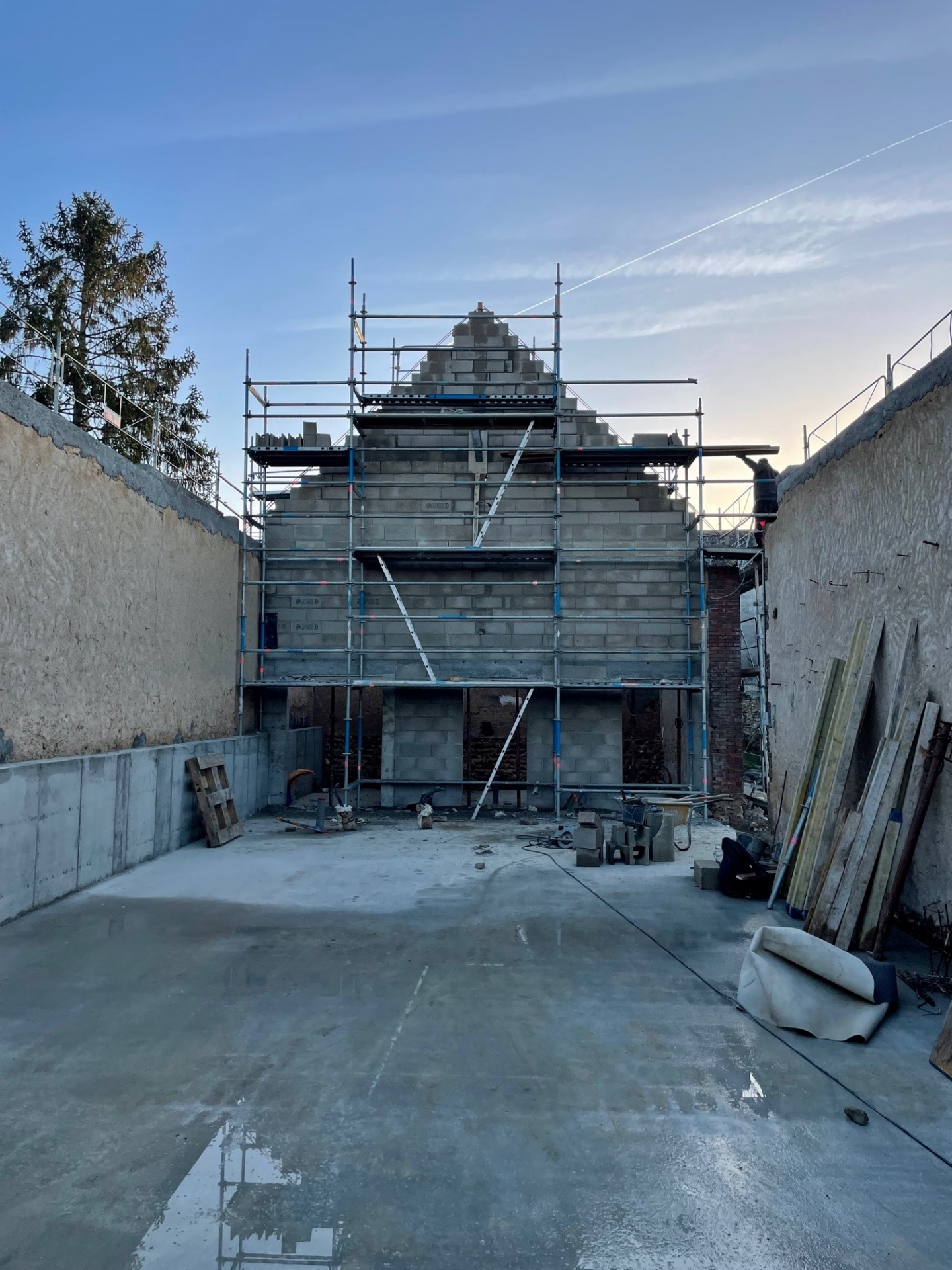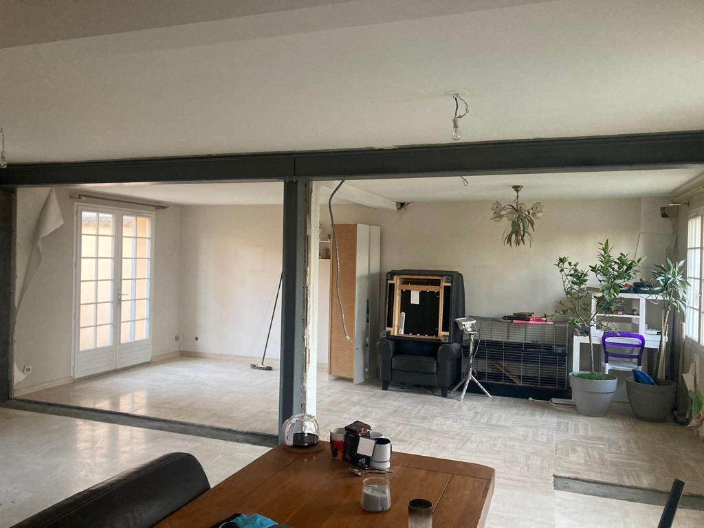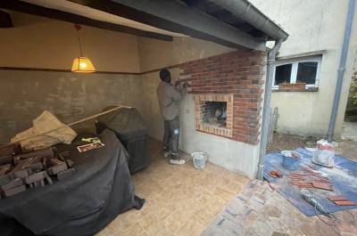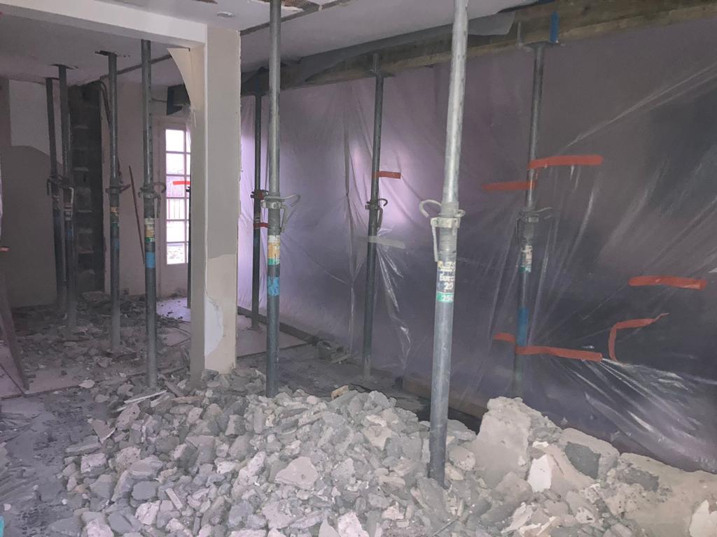 Démolitions de murs porteurs, création d’ouvertures, maçonnerie de bloc à bancher, poteaux et poutres BA, plancher BA coulés en place, terrasses, placage de pierres.