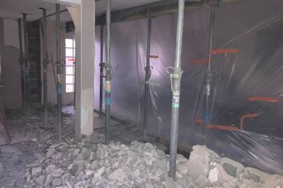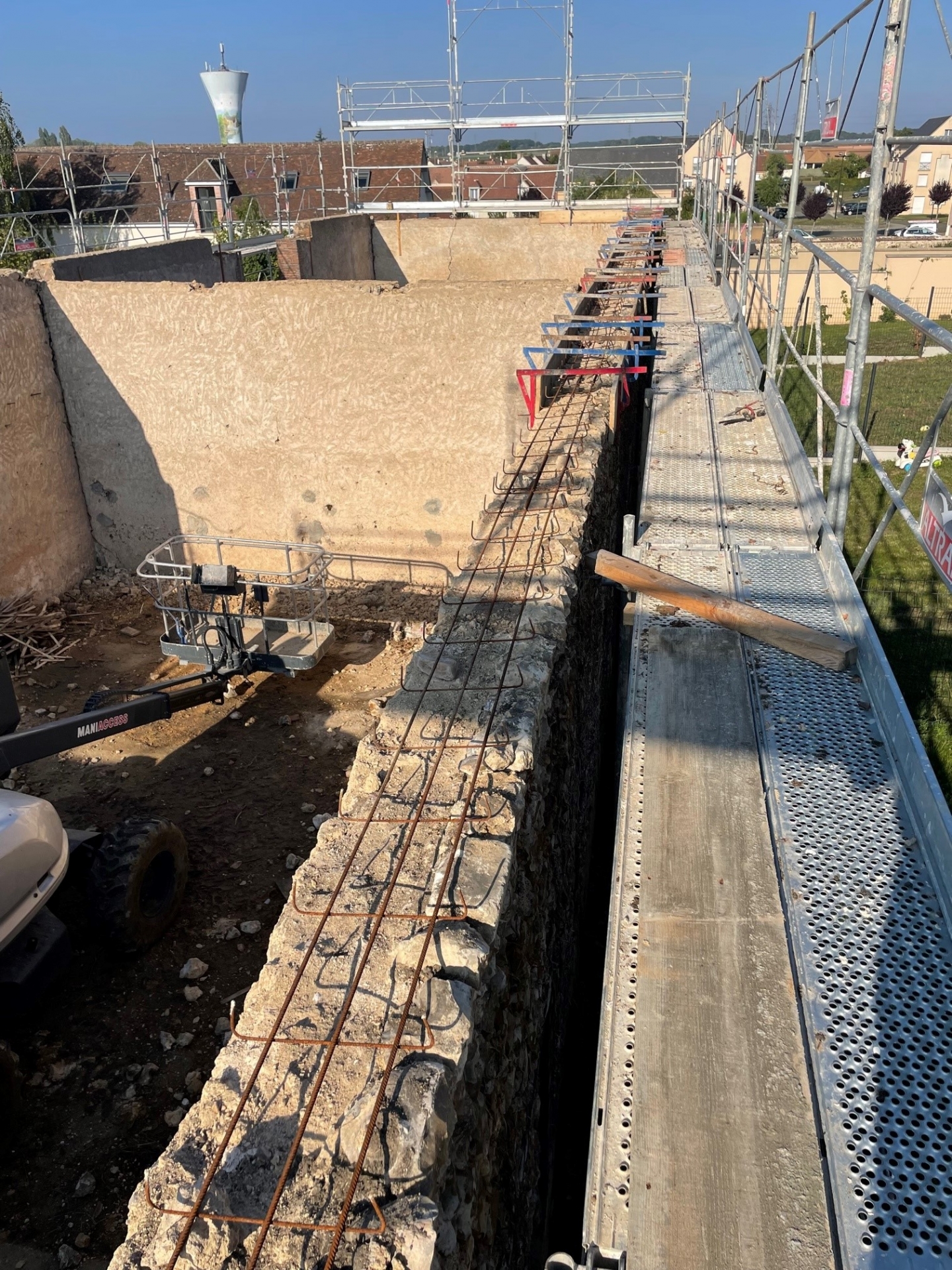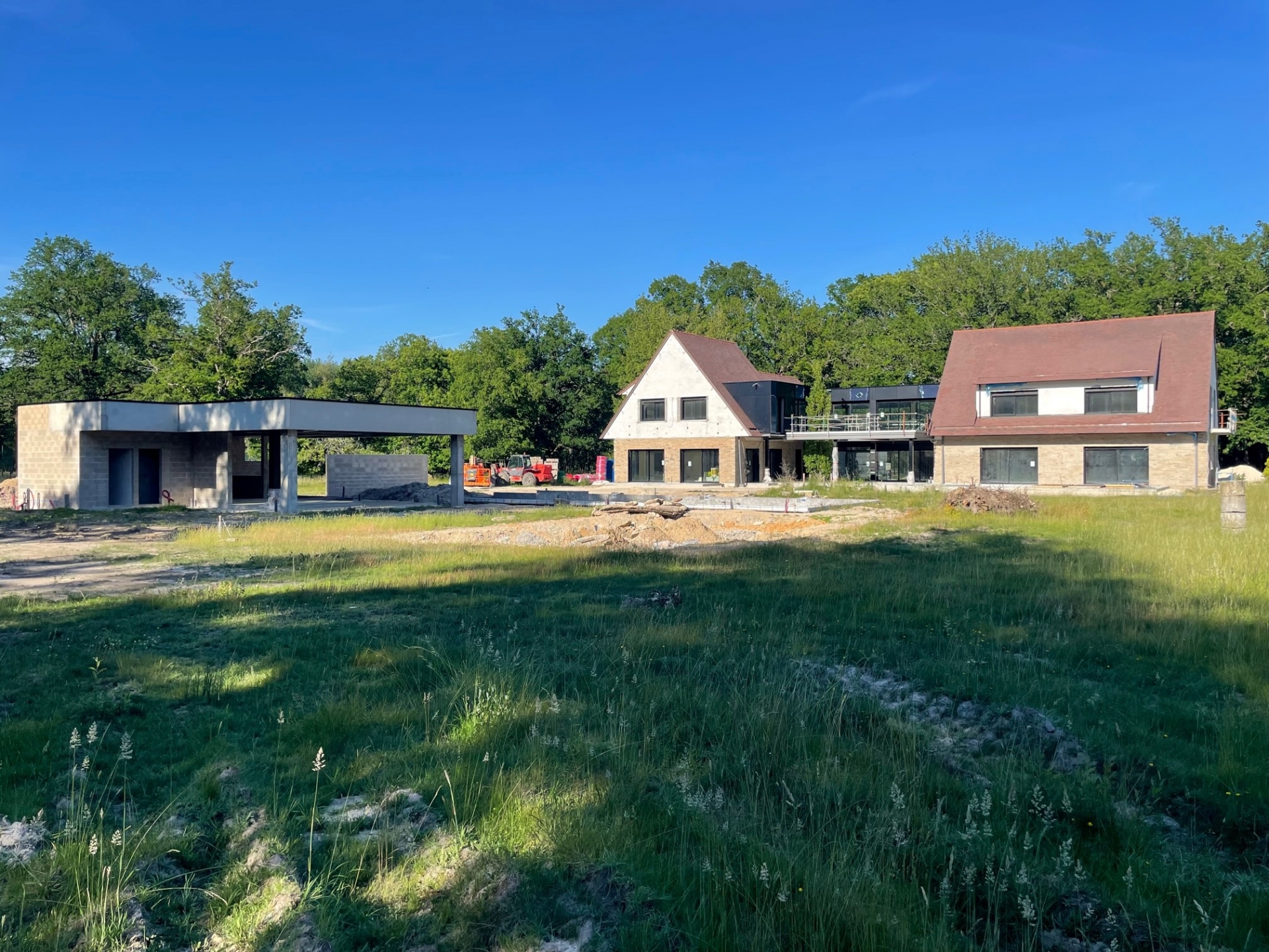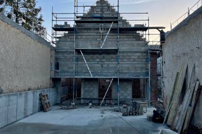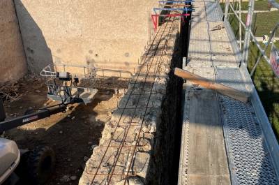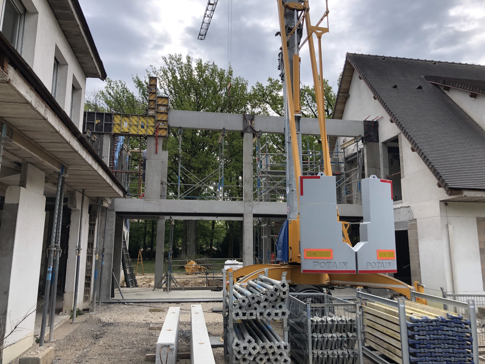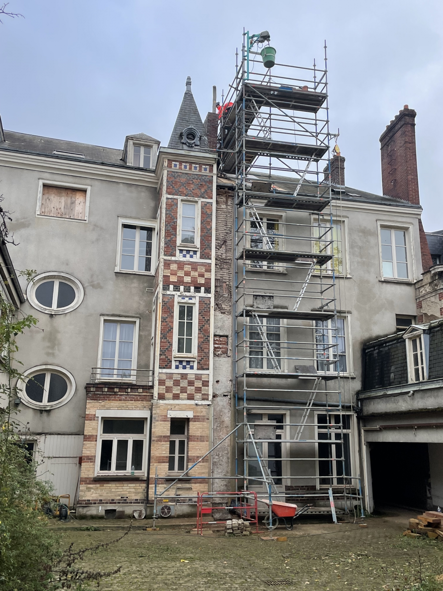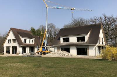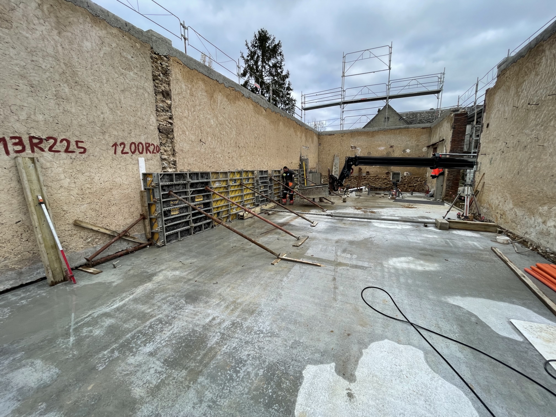 Démolitions de murs porteurs, création d’ouvertures, maçonnerie de bloc à bancher, poteaux et poutres BA, plancher BA coulés en place, terrasses, placage de pierres.