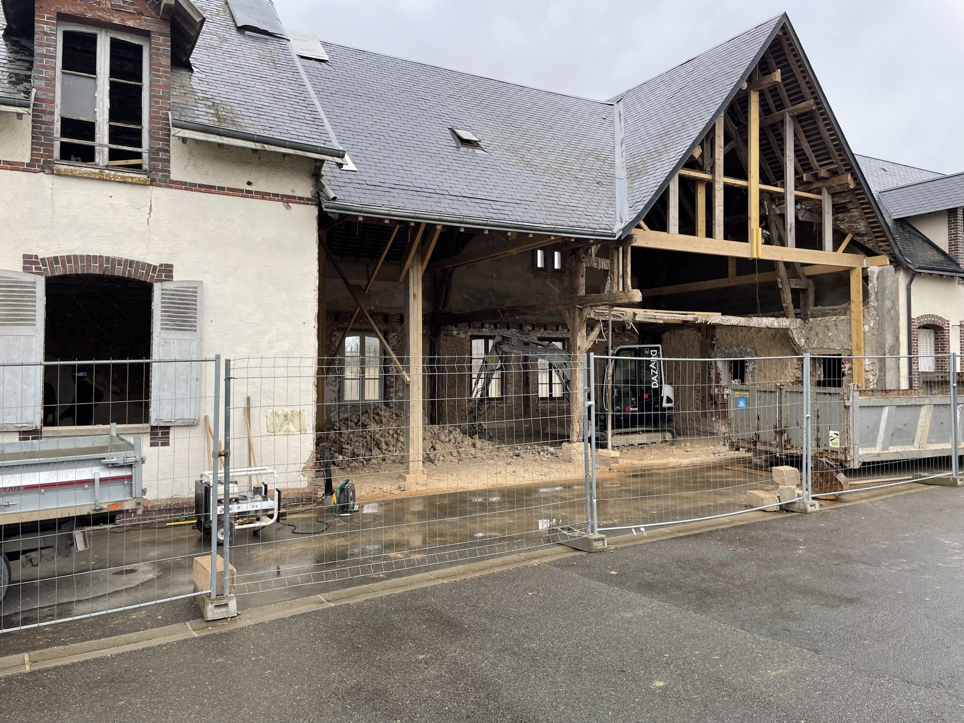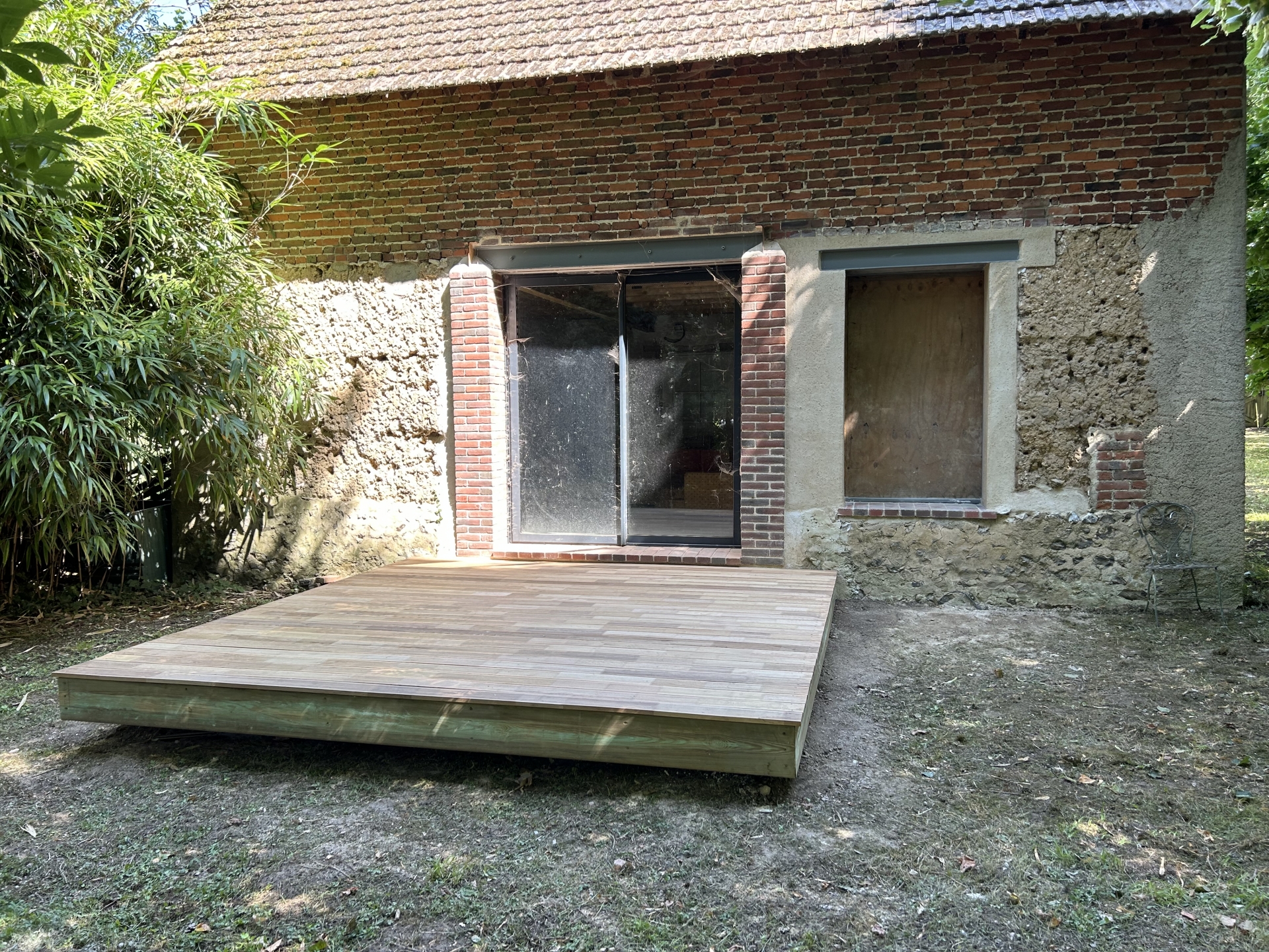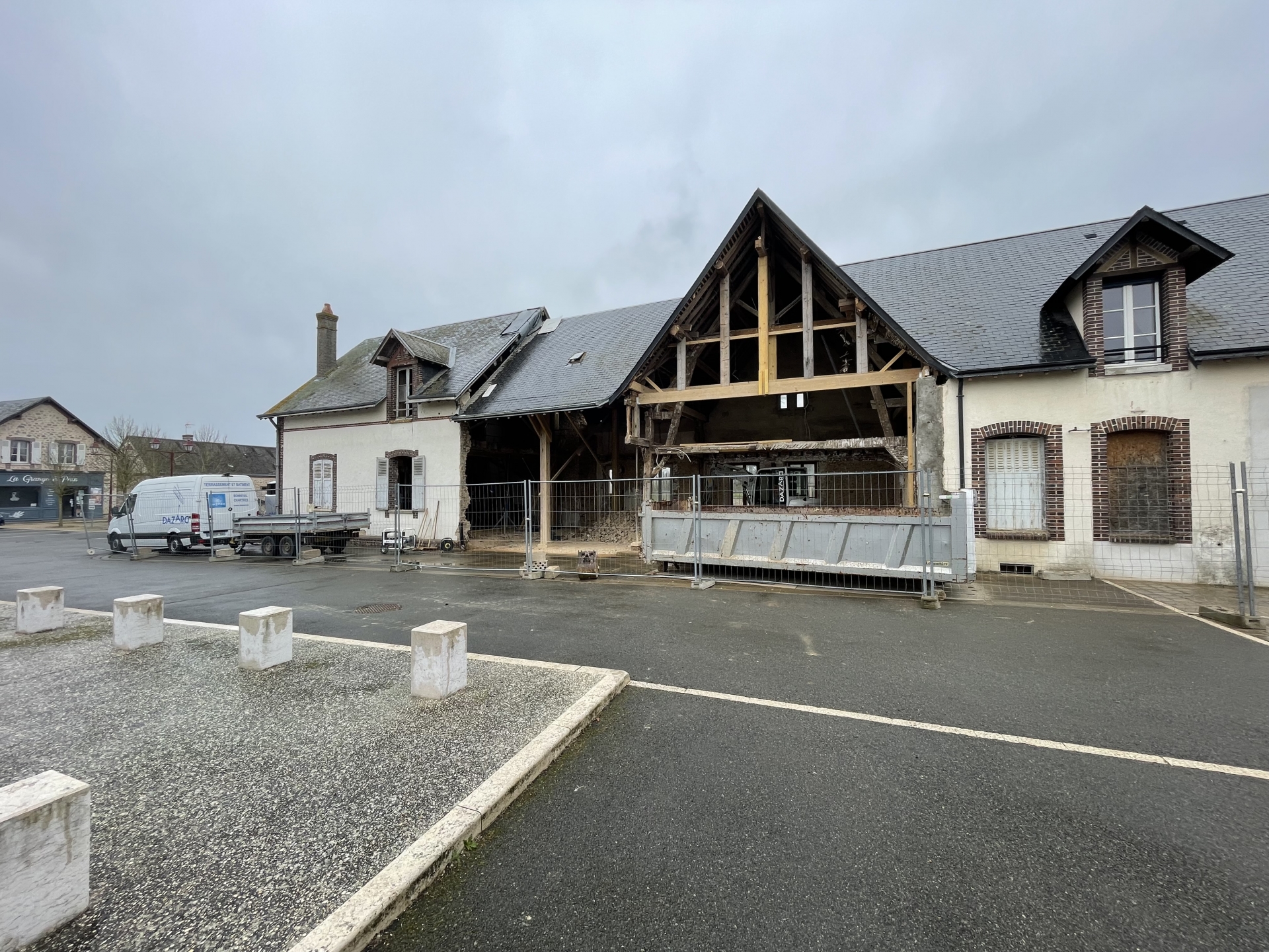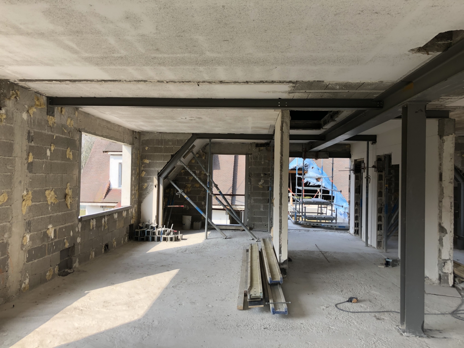 Démolitions de la charpente, murs porteurs, créations d’ouvertures, dalle portée, extension en maçonnerie de parpaings, bancs préfa en béton blanc.