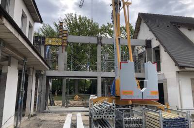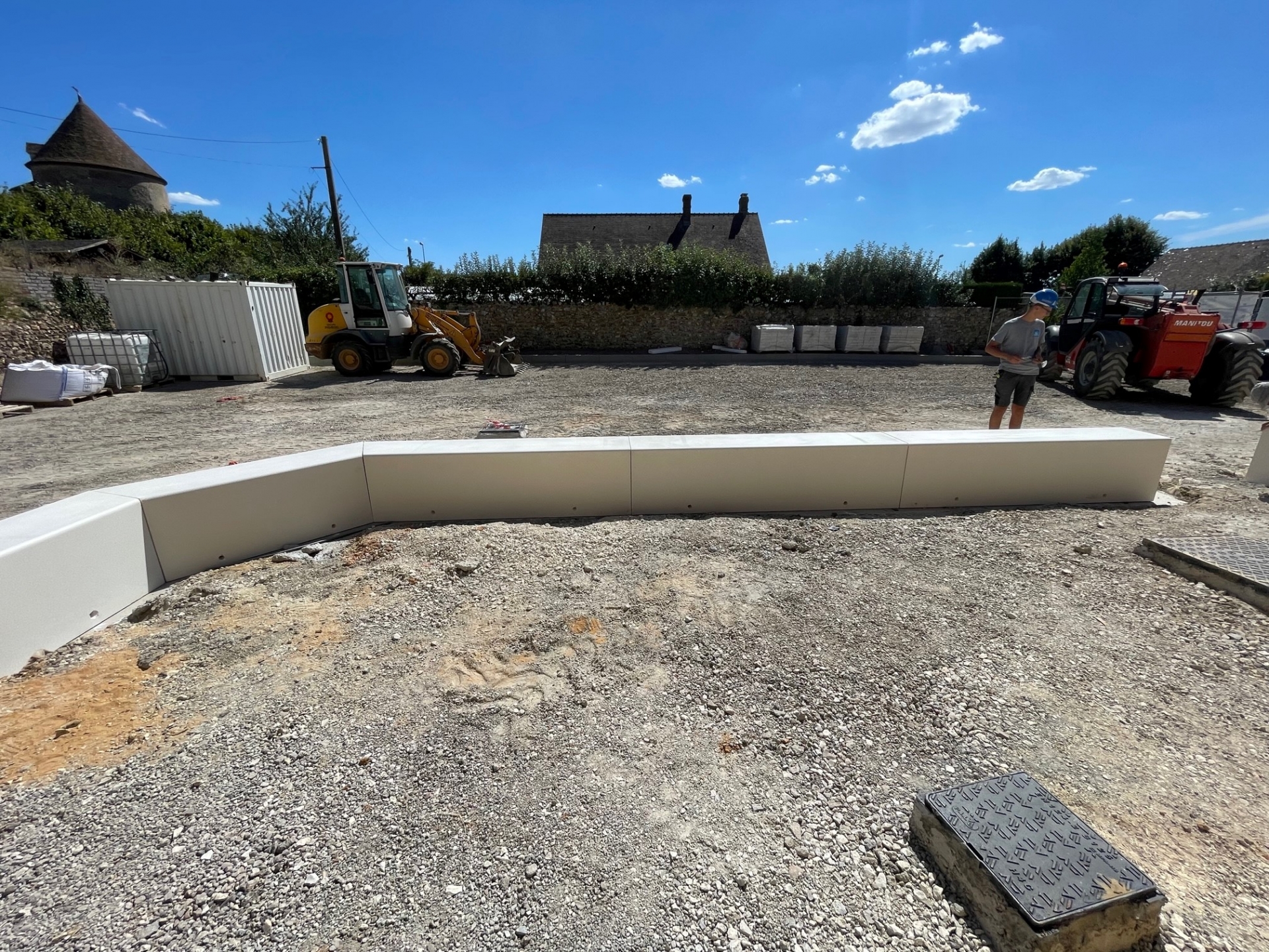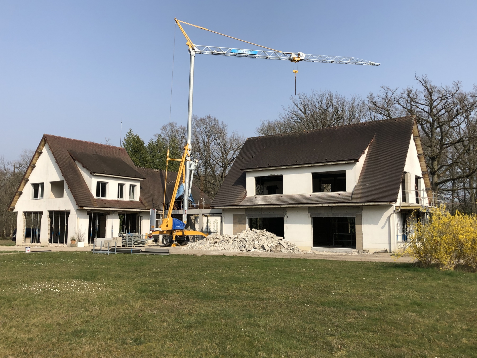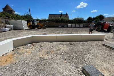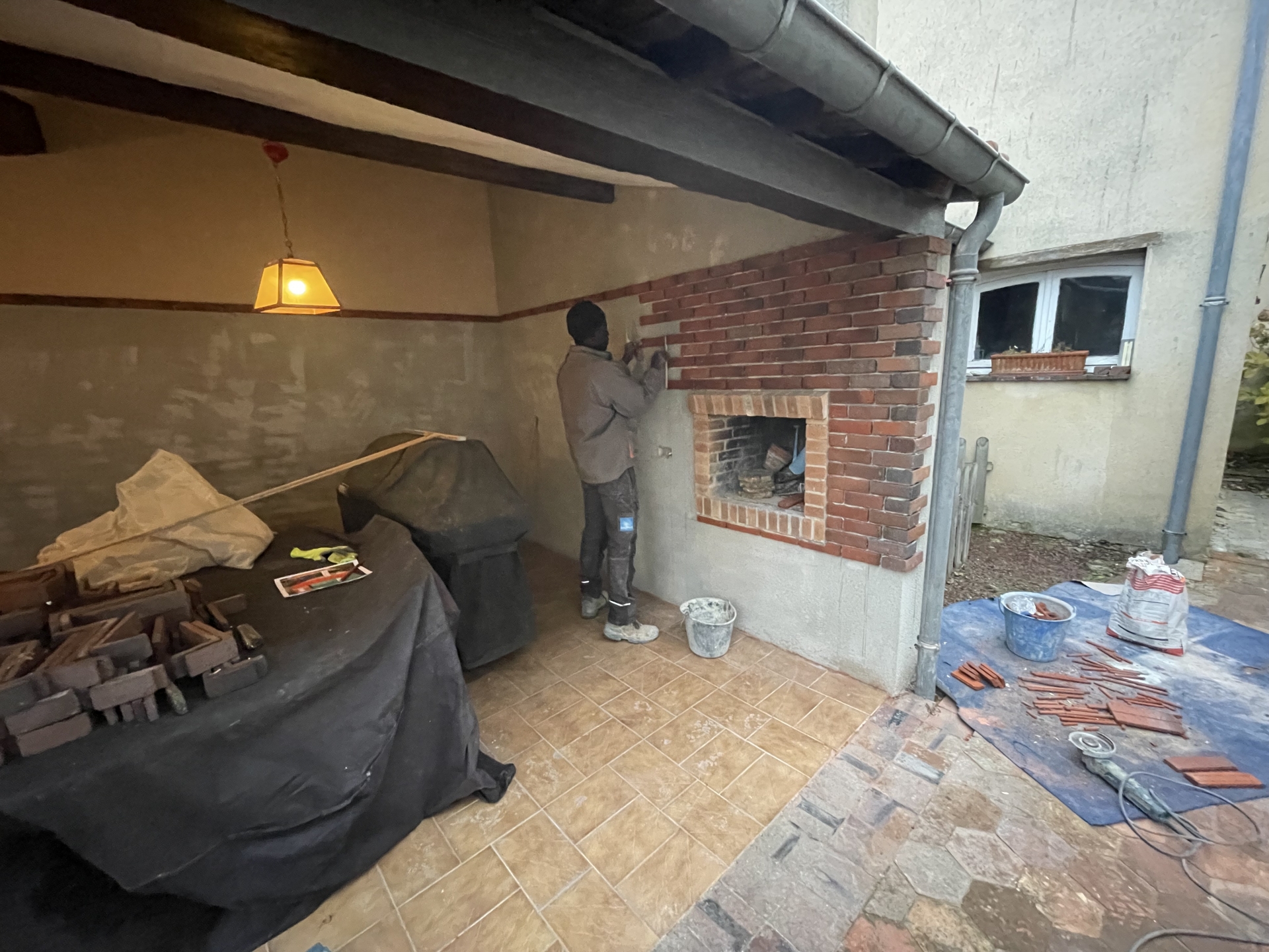 Démolitions de la charpente, murs porteurs, créations d’ouvertures, dalle portée, extension en maçonnerie de parpaings, bancs préfa en béton blanc.